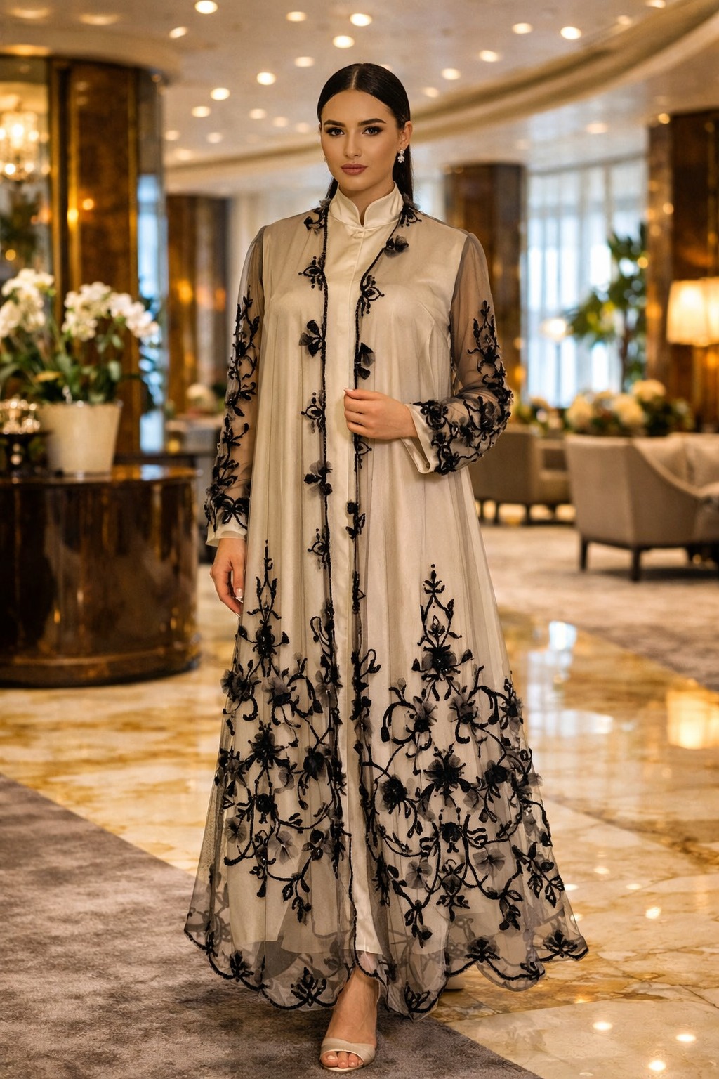 Soft beige elegance with bold black embroidery ✨A graceful tulle abaya that blends delicacy and sophistication for refined occasions 🤍