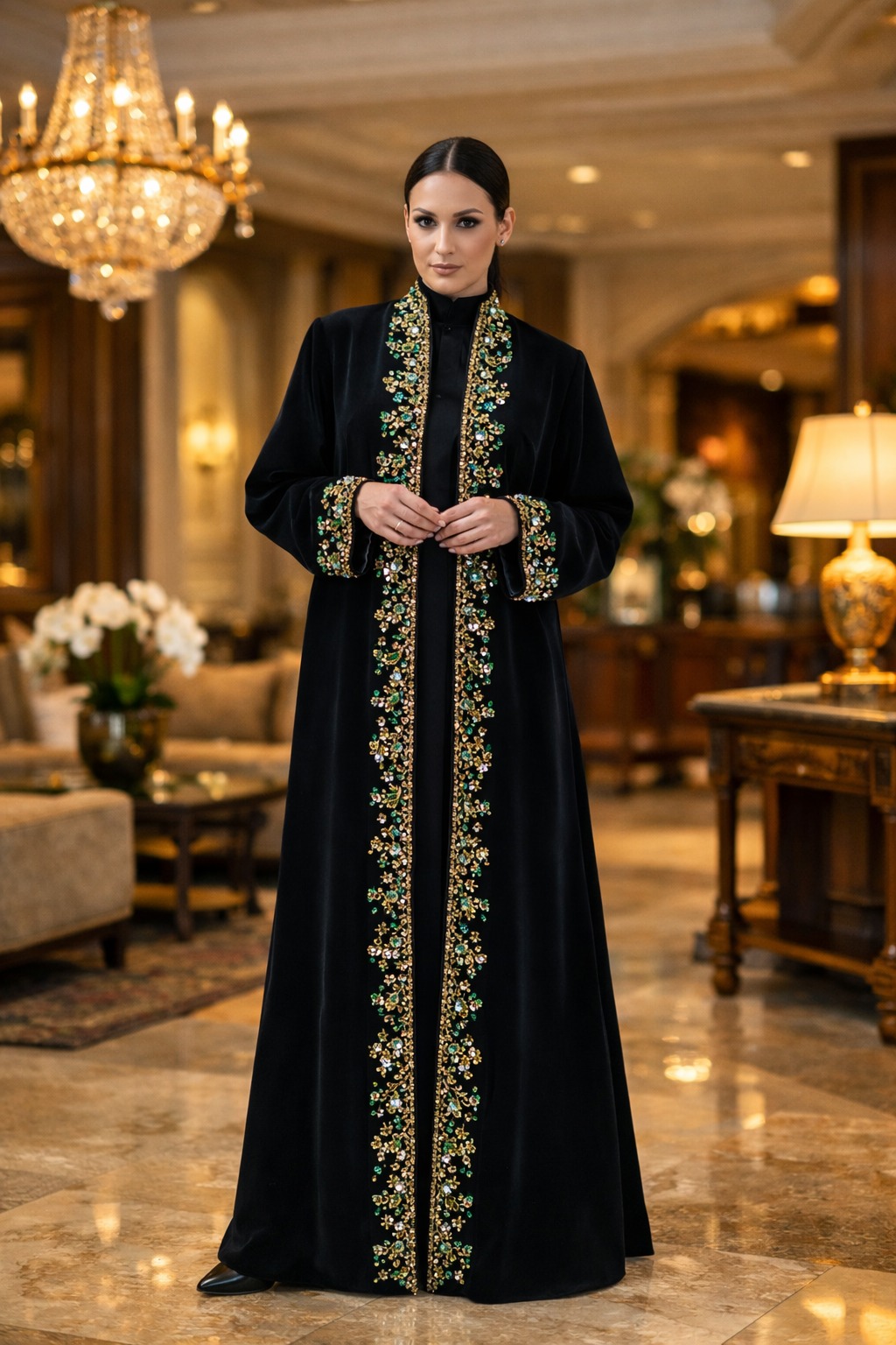 This black velvet abaya is elevated with intricate emerald and gold embroidery, designed to flow effortlessly with a regal silhouette. Soft velvet texture, refined craftsmanship, and timeless elegance—perfect for evenings that call for sophistication 🤍