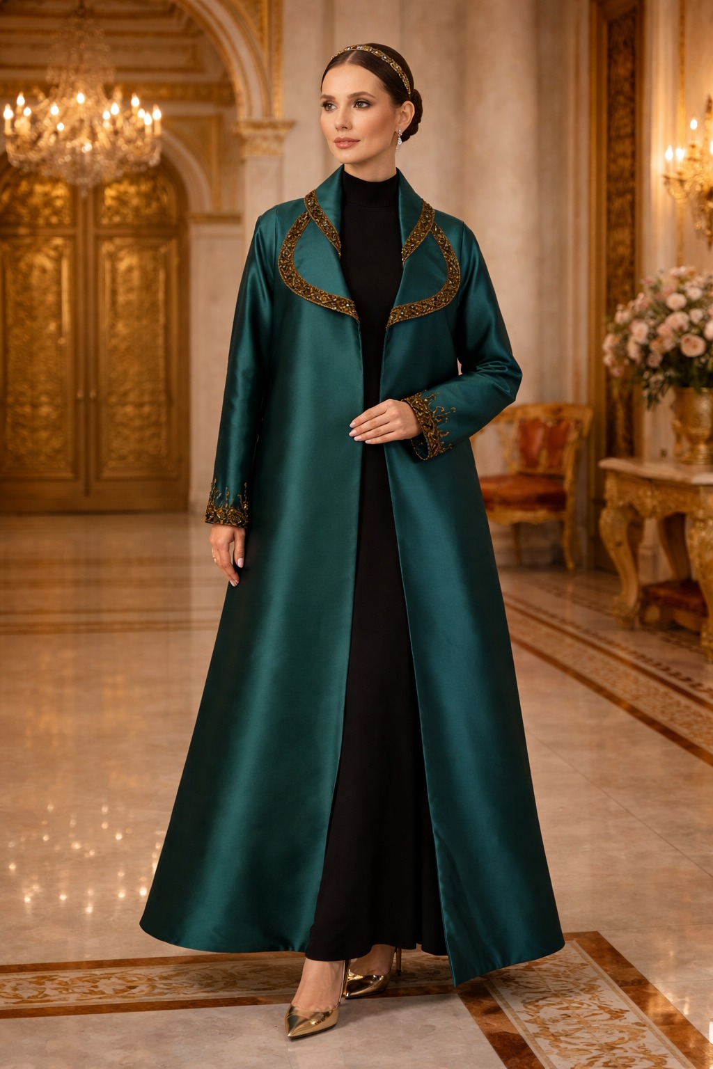 This elegant abaya features a rich emerald green satin finish, exuding a luxurious and polished look. The open-front design is beautifully framed with intricate gold embroidery along the collar, adding a regal touch. Delicate detailing on the sleeve cuffs enhances its sophistication, while the flowing silhouette offers graceful movement. Paired with a sleek black inner dress, it creates a refined and timeless ensemble perfect for special occasions.